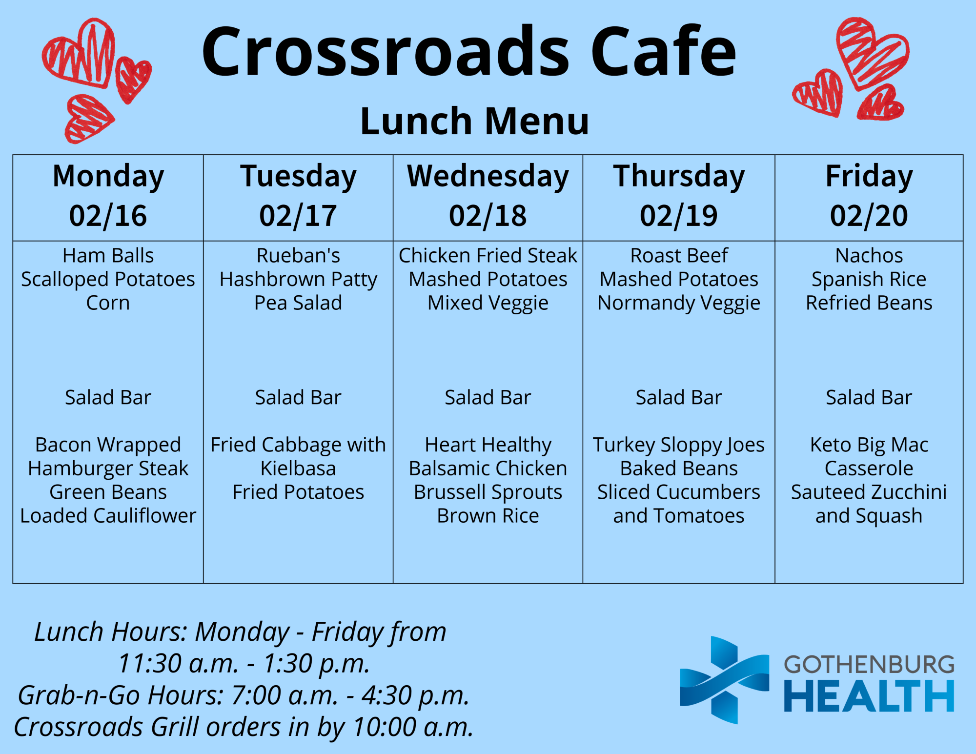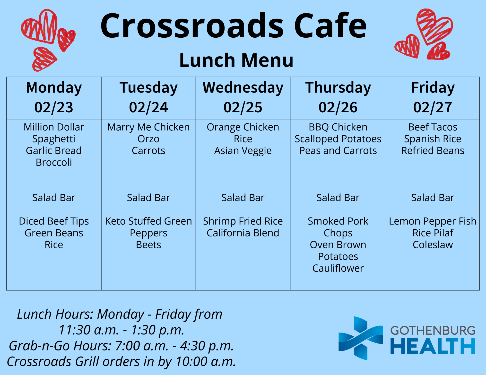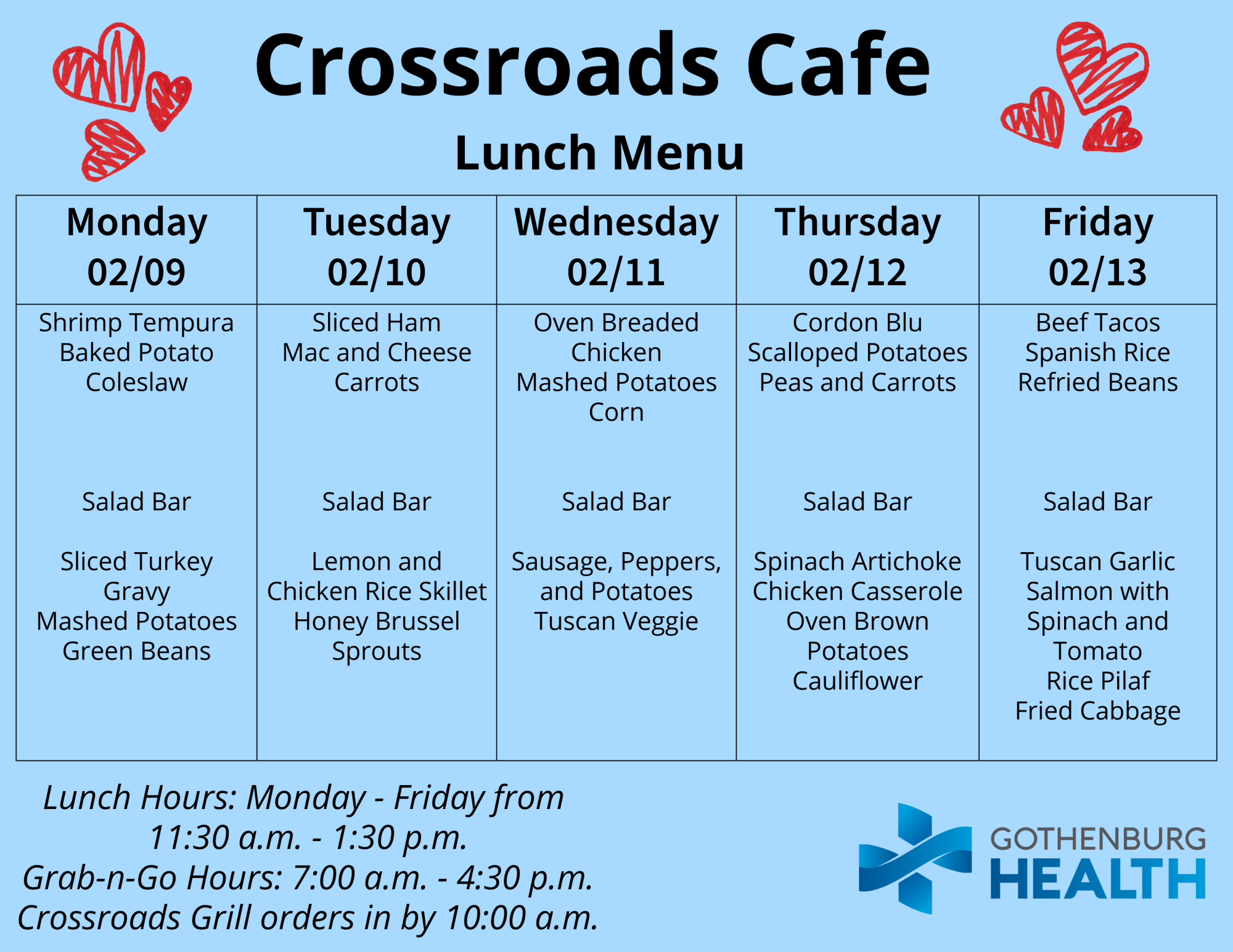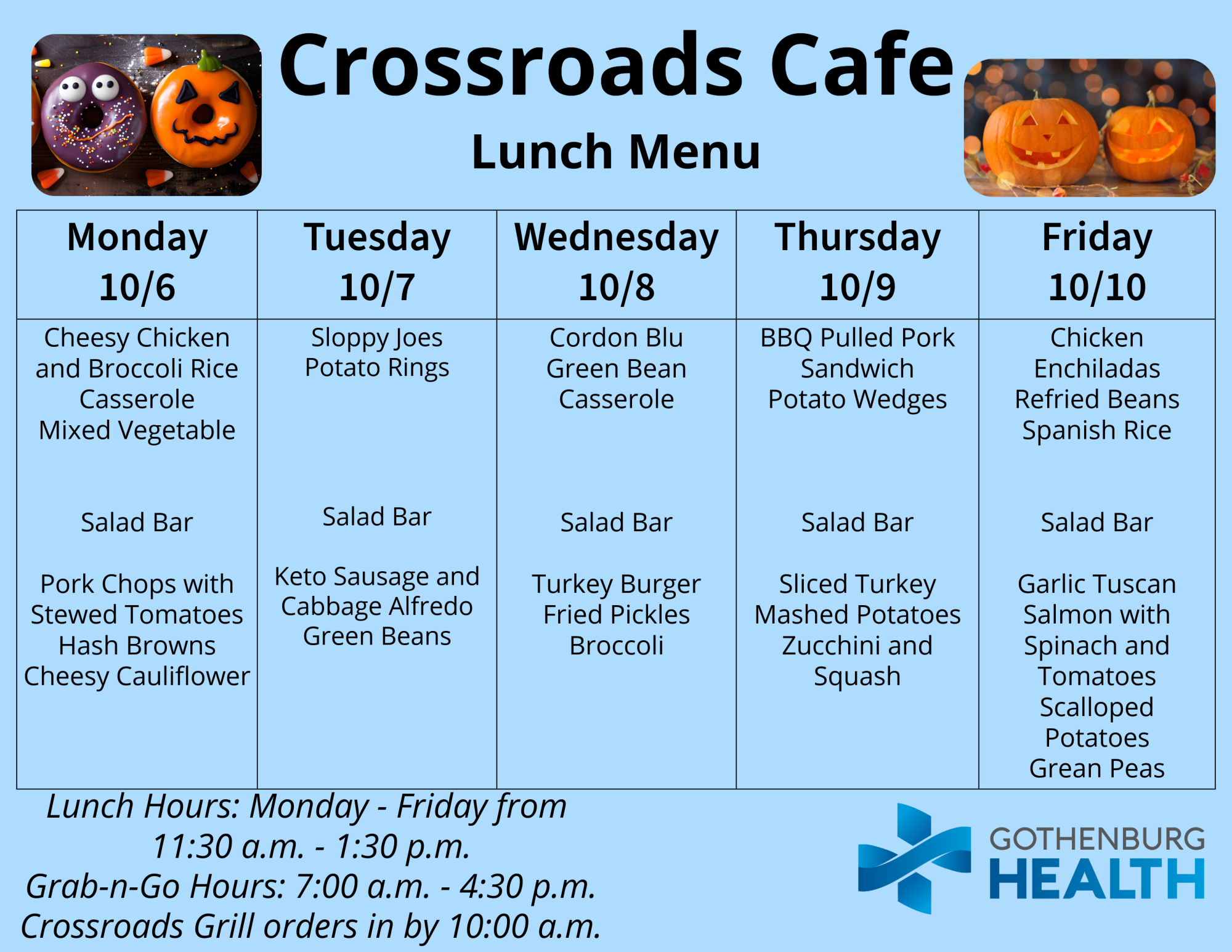 Also, you can find the weekly menu on our Facebook page, which is published every Monday: https://www.facebook.com/GburgHealth/.