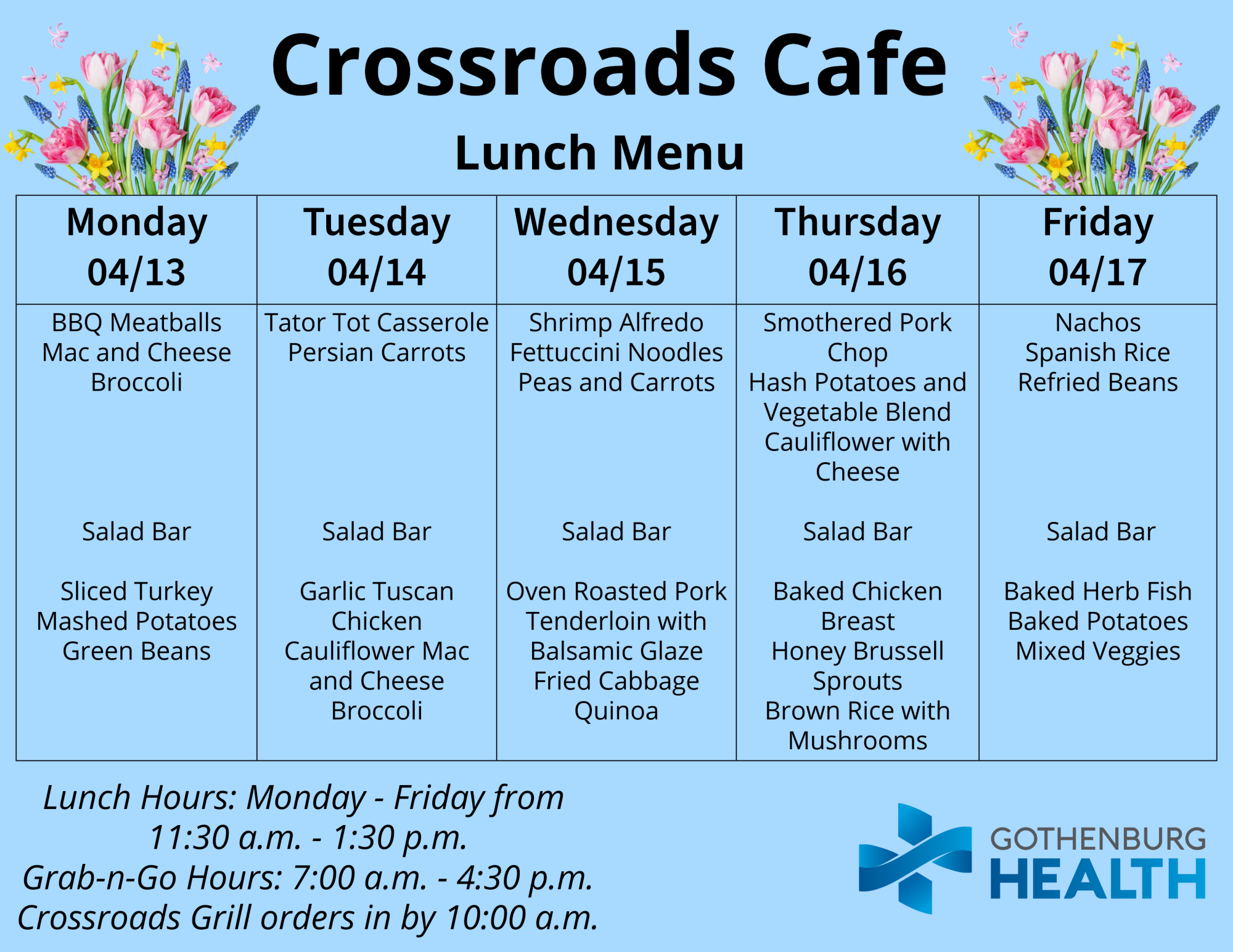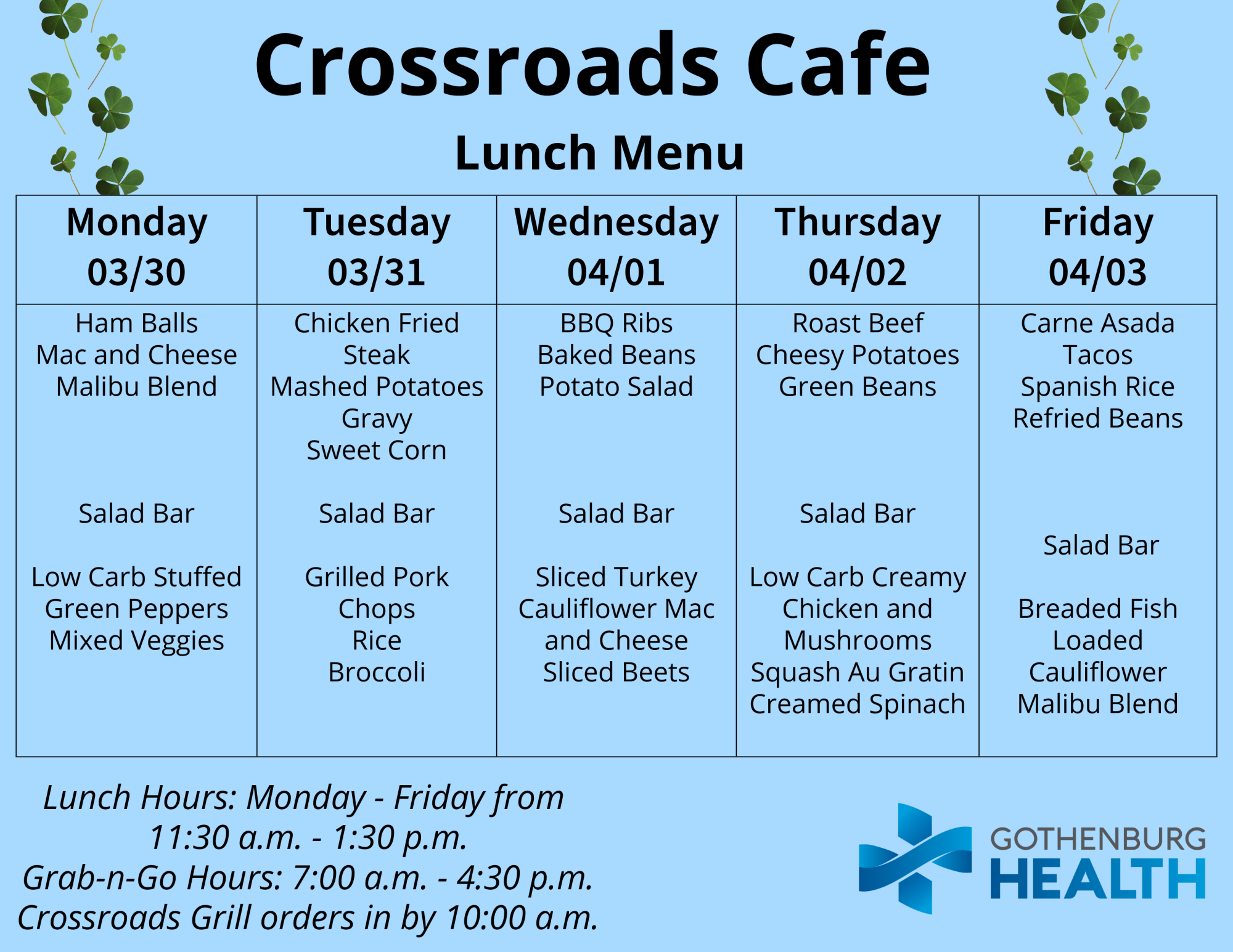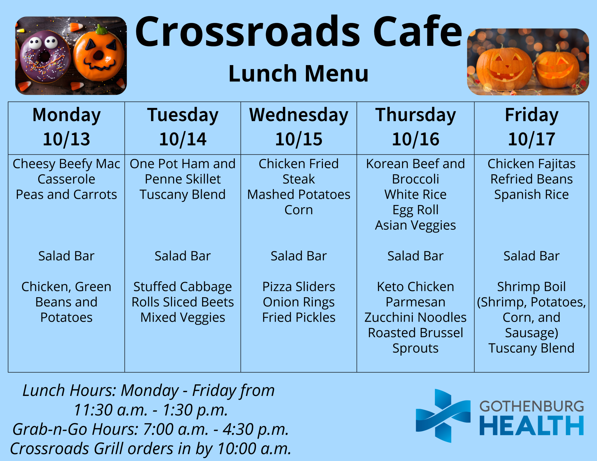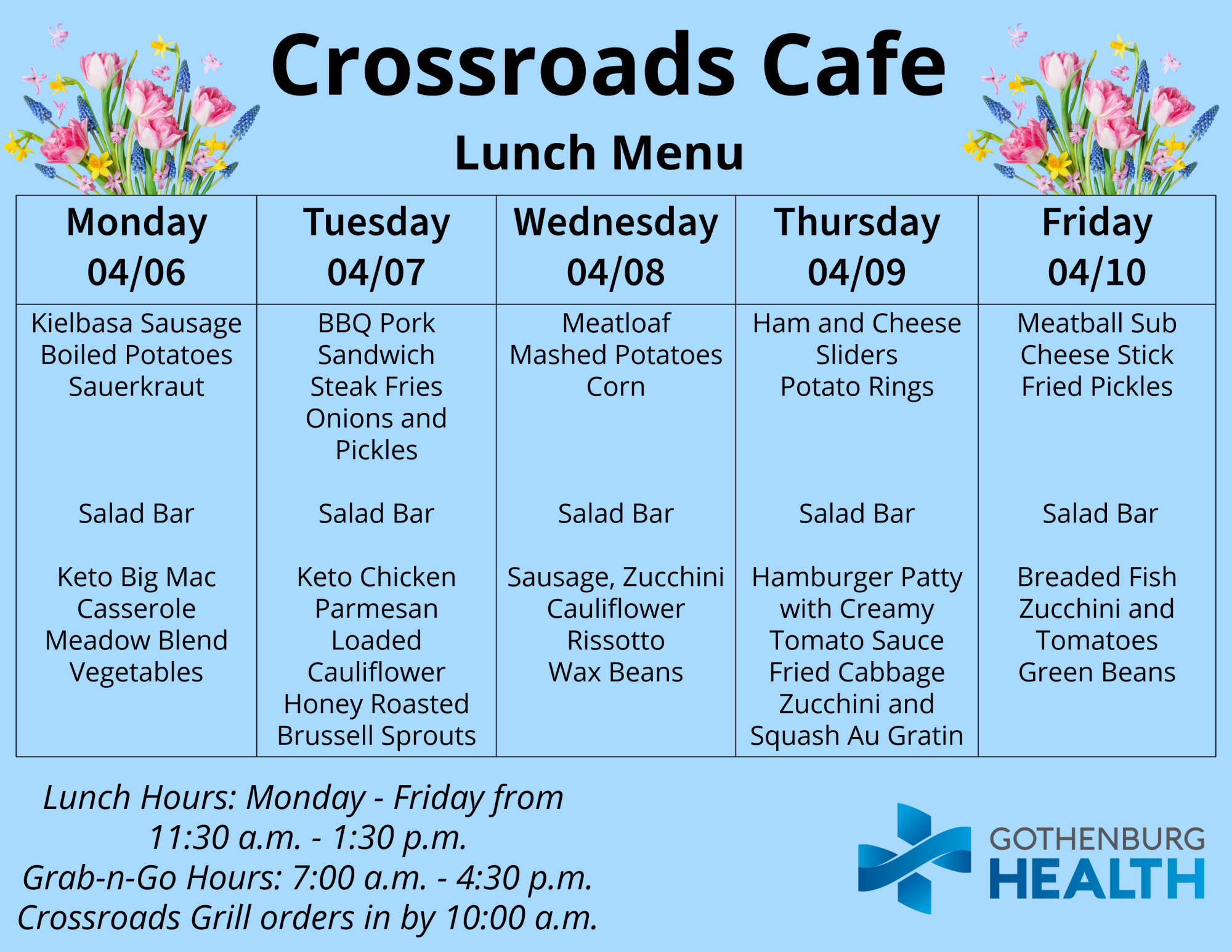Also, you can find the weekly menu on our Facebook page, which is published every Monday: https://www.facebook.com/GburgHealth/.