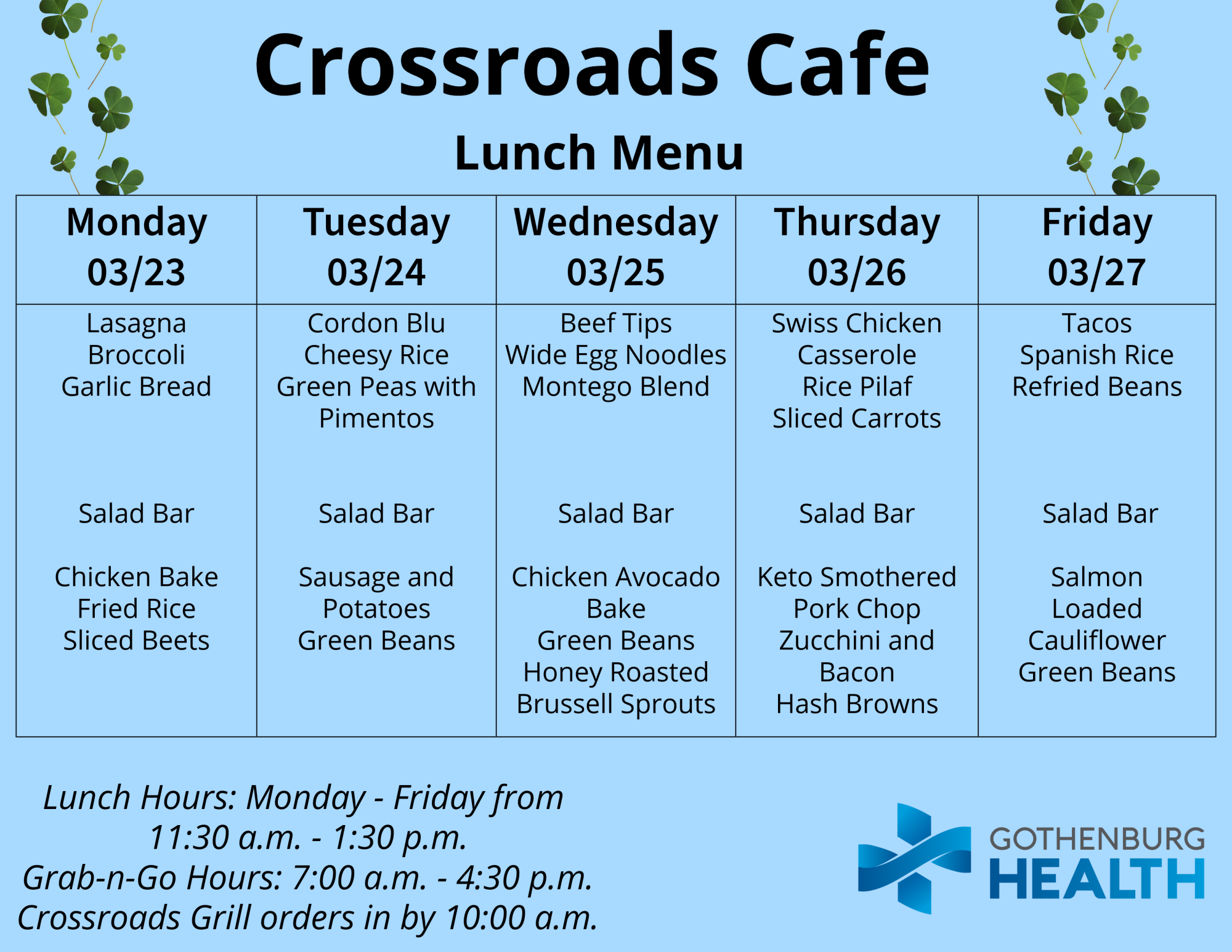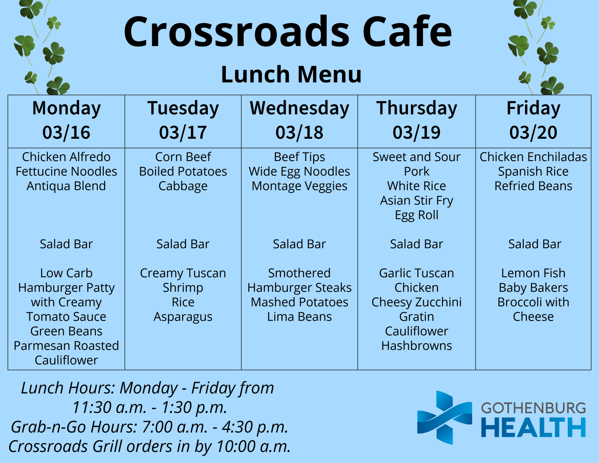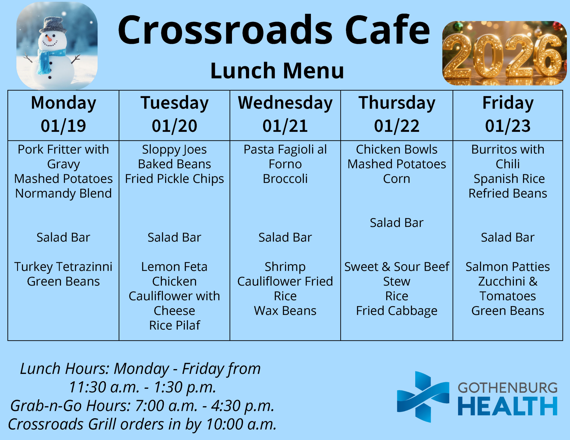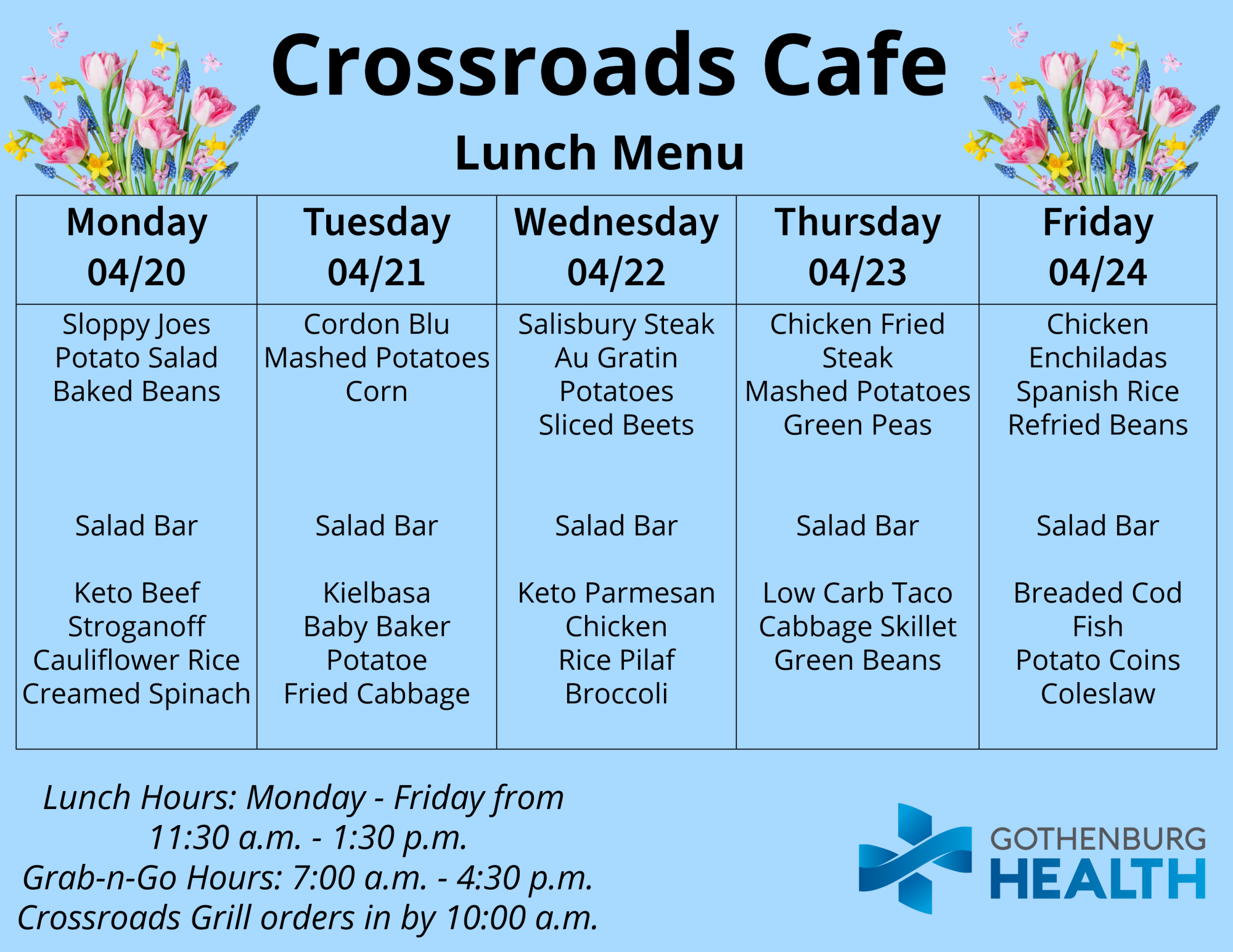 Also, you can find the weekly menu on our Facebook page, which is published every Monday: https://www.facebook.com/GburgHealth/.