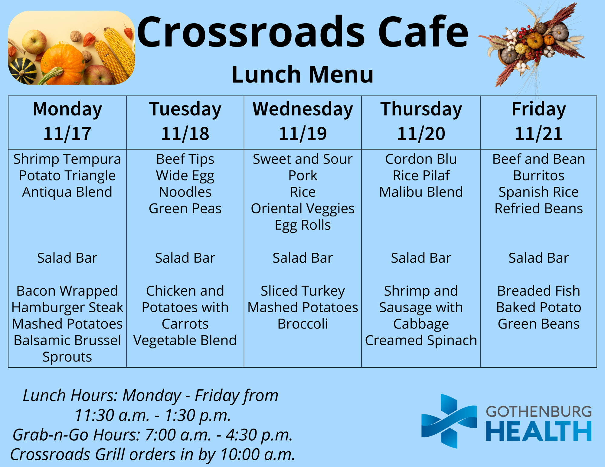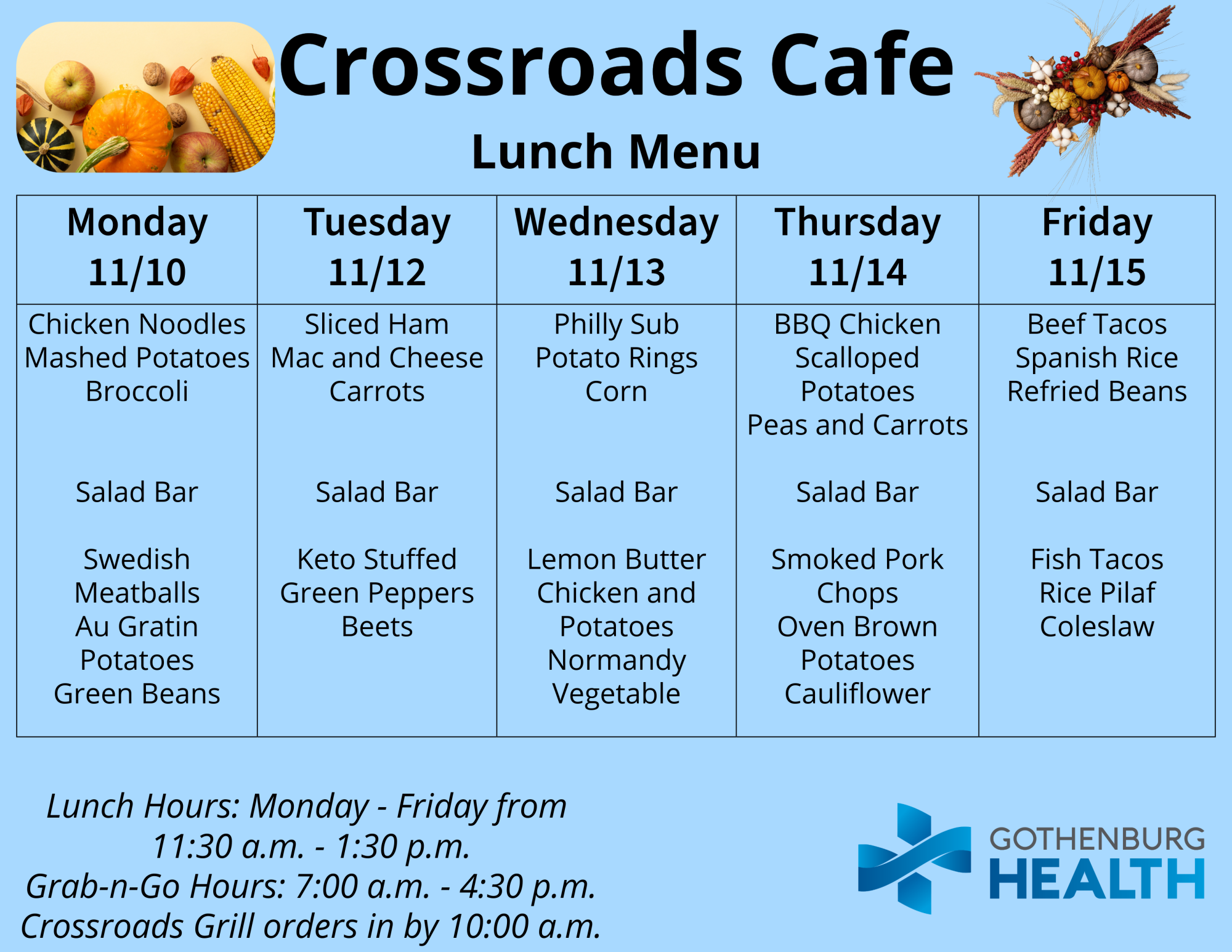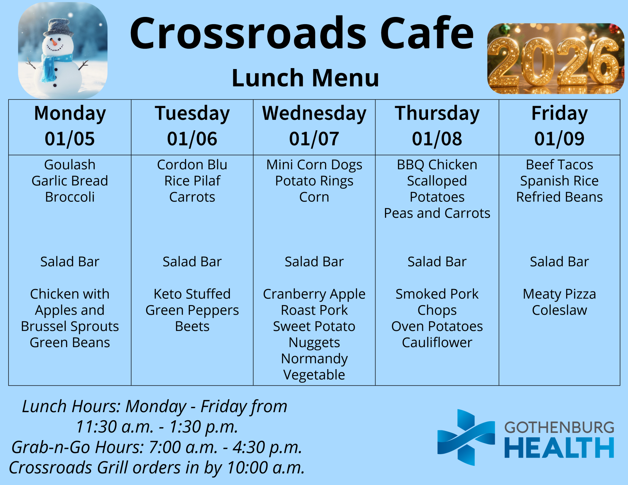 Crossroads Cafe opened at Gothenburg Health in the spring of 2018. The cafe is open to the public for breakfast and lunch. The community is encouraged to come to enjoy a delicious salad bar, homemade entrees, and a variety of healthy choices. When looking for a place to eat, the Crossroads Cafe hopes you'll come to eat with us!